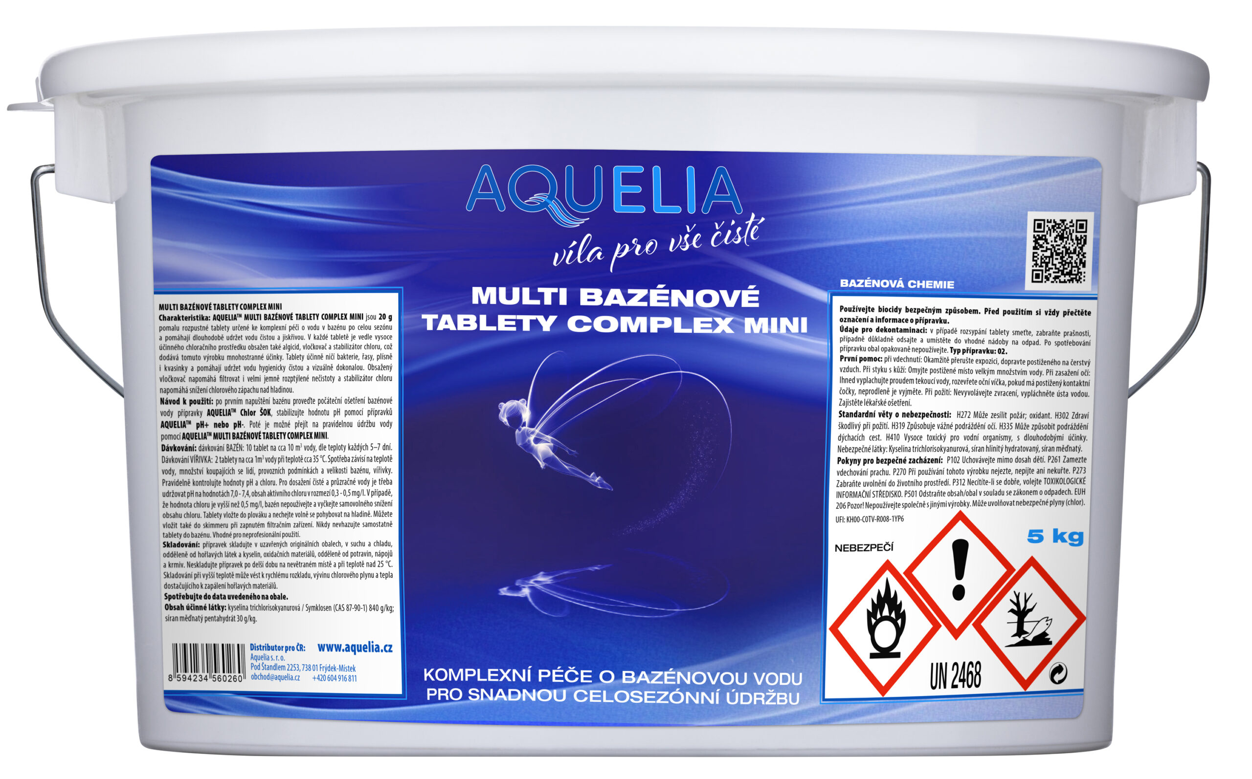 Skladování: Přípravek skladujte v uzavřených originálních obalech, v suchu a chladu, odděleně od hořlavých látek a kyselin, oxidačních materiálů, odděleně od potravin, nápojů a krmiv. Neskladujte přípravek po delší dobu na nevětraném místě a při teplotě nad 25 °C. Skladování při vyšší teplotě může vést k rychlému rozkladu, vývinu chlorového plynu a tepla dostačujícího k zapálení hořlavých materiálů. Spotřebujte do data uvedeného na obale. Obsah účinné látky: Kyselina trichlorisokyanurová / Symklosen (CAS 87-90-1) 840 g/kg; síran měďnatý pentahydrát 30 g/kg. Používejte biocidy bezpečným způsobem. Před použitím si vždy přečtěte označení a informace o přípravku. Údaje pro dekontaminaci: V případě rozsypání tablety smeťte, zabraňte prašnosti, případně důkladně odsajte a umístěte do vhodné nádoby na odpad. Po spotřebování přípravku obal opakovaně nepoužívejte. První pomoc: Při vdechnutí: Okamžitě přerušte expozici, dopravte postiženého na čerstvý vzduch. Při styku s kůží: Omyjte postižené místo velkým množstvím vody. Při zasažení očí: Ihned vyplachujte proudem tekoucí vody, rozevřete oční víčka, pokud má postižený kontaktní čočky, neprodleně je vyjměte. Při požití: Nevyvolávejte zvracení, vypláchněte ústa vodou. Zajistěte lékařské ošetření. Standardní věty o nebezpečnosti: H272 Může zesílit požár; oxidant. H302 Zdraví škodlivý při požití. H319 Způsobuje vážné podráždění očí. H335 Může způsobit podráždění dýchacích cest. H410 Vysoce toxický pro vodní organismy, s dlouhodobými účinky. Nebezpečné látky: Kyselina trichlorisokyanurová, síran hlinitý hydratovaný, síran měďnatý. Pokyny pro bezpečné zacházení: Uchovávejte mimo dosah dětí. Zamezte vdechování prachu. Při používání tohoto výrobku nejezte, nepijte ani nekuřte. Zabraňte uvolnění do životního prostředí. Necítíte-li se dobře, volejte TOXIKOLOGICKÉ INFORMAČNÍ STŘEDISKO. P501 Odstraňte obsah/obal v souladu se zákonem o odpadech. EUH 206 Pozor! Nepoužívejte společně s jinými výrobky. Může uvolňovat nebezpečné plyny (chlor).